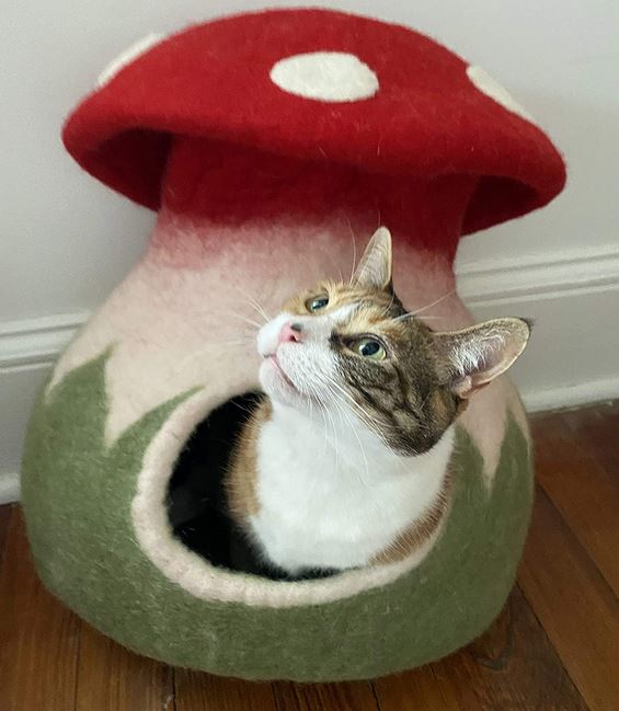 Here is another cute cat cave for your pets. The Mokoboho Mushroom Felt Cat Cave can handle up to 15-pound kitties. It is 16 inches across and 20 inches high. It has a 100% natural wool felt construction to keep your pets warm and cozy.
